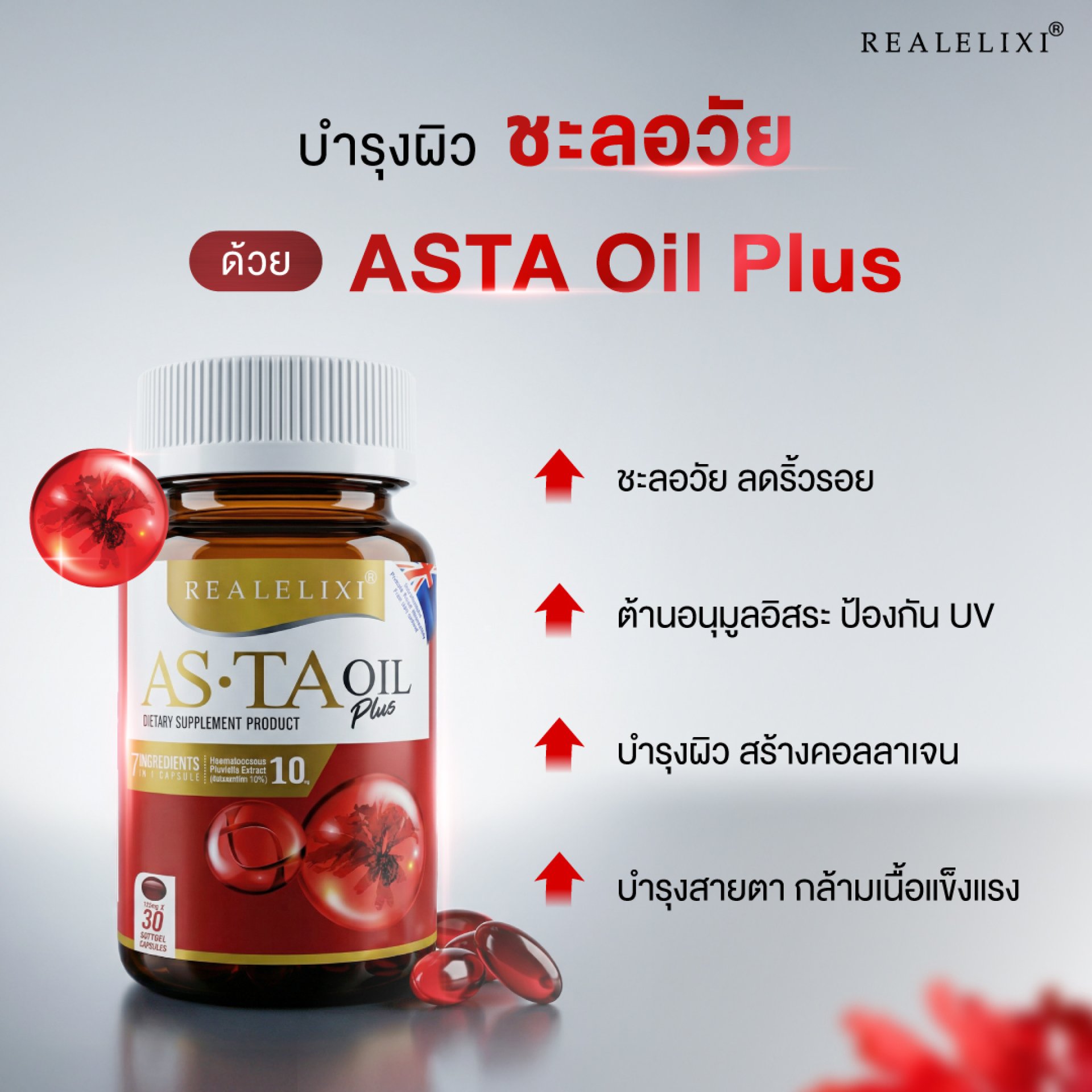 ASTA OIL มีสาร Astaxanthin ซึ่งเป็นสารต้านอนุมูลอิสระประสิทธิภาพสูง ช่วยปกป้องเซลล์ในร่างกายจากความเสื่อม อันเป็นสาเหตุของริ้วรอย ผิวหมองคล้ำ และปัญหาสุขภาพในระยะยาว เหมาะสำหรับผู้ที่ต้องการดูแลสุขภาพและผิวพรรณจากภายในอย่างต่อเนื่อง